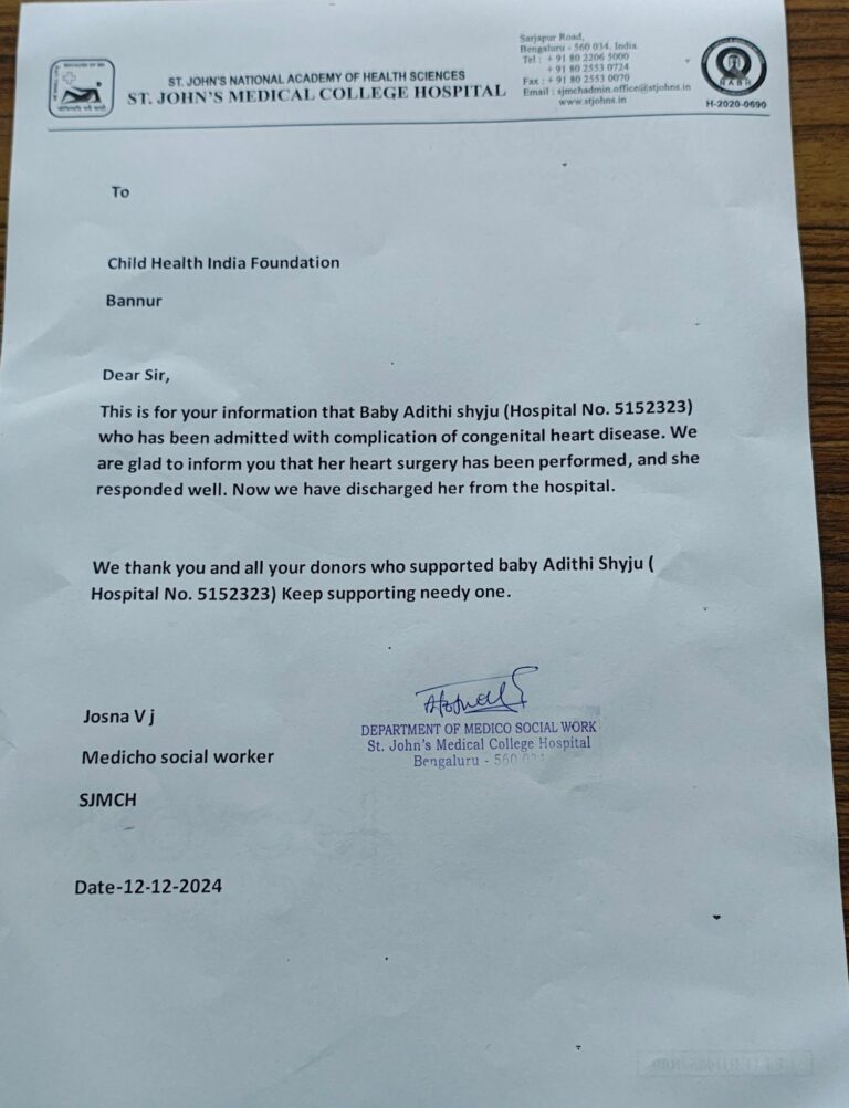 It gives immense pleasure to inform you that baby Adithi has successfully completed her Heart surgery by gods grace she recovered well. We thank all our donors and supporters. Without your support, we couldn’t have done this. Thank you for making a difference.