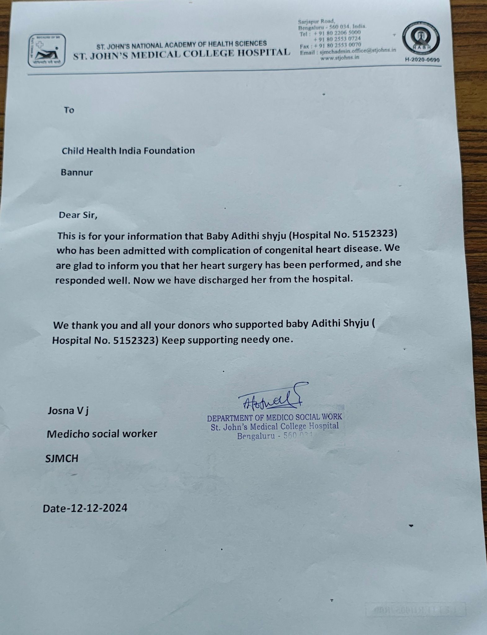 St. John’s Hospital Bangalore, treating this child has referred this case for financial support.