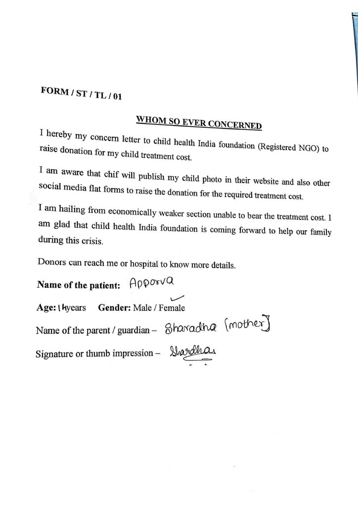 Child Health India Foundation is a non-profit organization working on this medical case. our moto is to raise sufficient funds for baby Deepakshi to complete her treatment.