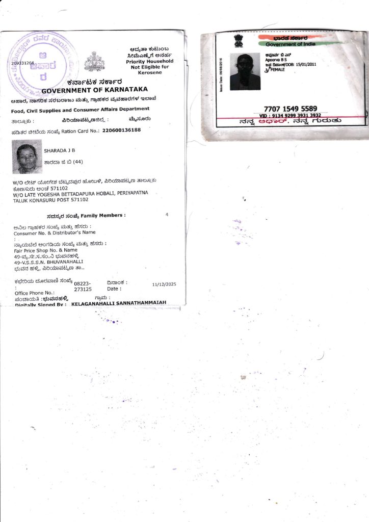 Unfortunately, she belongs to an economically weaker family. Her mother’s name is Mrs. Sharadha, W/o Late Yogesha, and she is a resident of Bettadapura.