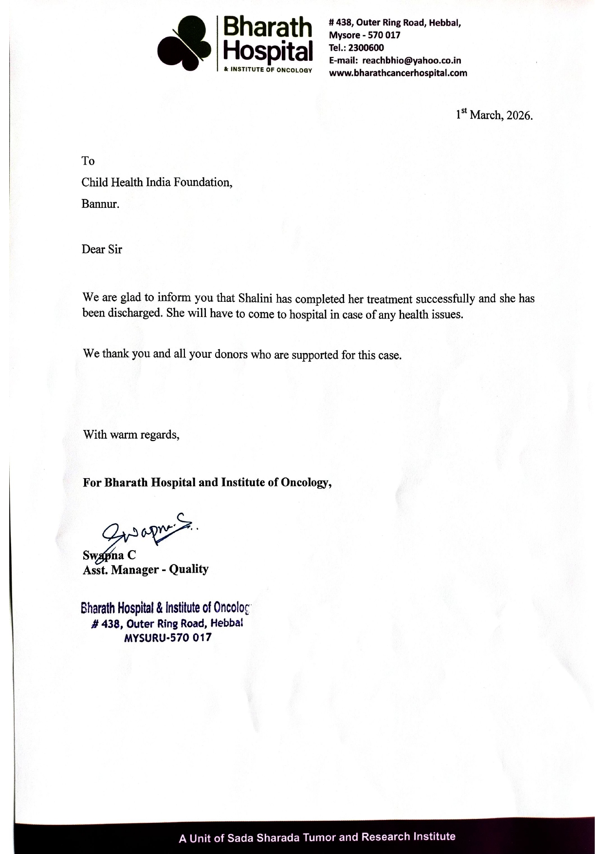 It gives immense pleasure to inform you that baby Shalini has successfully completed her treatment by gods grace she recovered well. We thank all our donors and supporters. Without your support, we couldn’t have done this. Thank you for making a difference